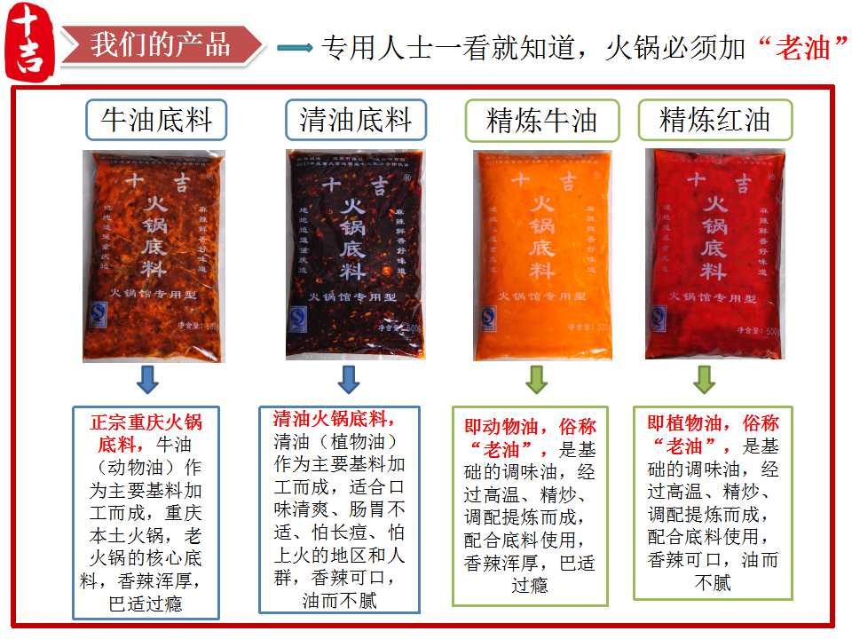重庆吉味阁餐饮管理有限责任公司,旗下重庆十吉火锅底料调料,我们是重庆大型的、历史悠久的火锅底料、调味品专业生产厂家之一,超1000家火锅店采用我们底料,同时为各大连锁火锅品牌代工生产底料。正宗重庆地道口味火锅店专用底料,老火锅、牛油火锅、清油火锅、炖汤料等底料/调料批发销售。同时提供火锅底料贴牌、代加工、来料加工等服务。我们提供各种火锅底料调料,一次性火锅红油老油,麻辣小面调料等批发销售,代加工贴牌等服务,同时提供火锅加盟,餐饮加盟,技术培训,餐饮培训等服务!