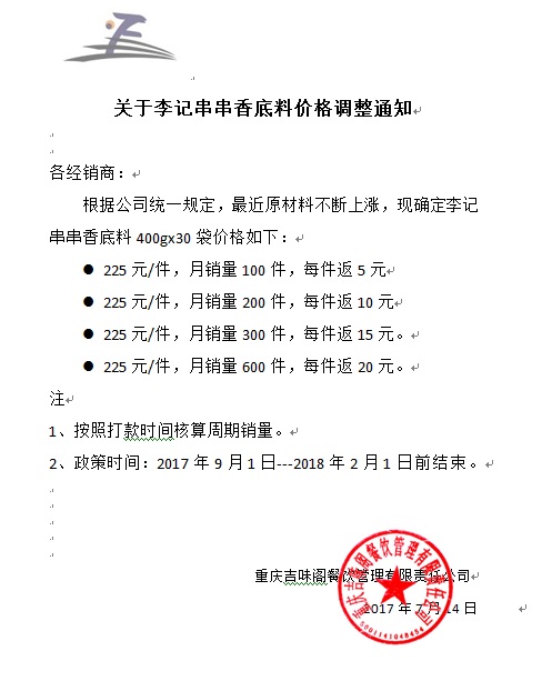 关于李记串串香底料价格调整通知